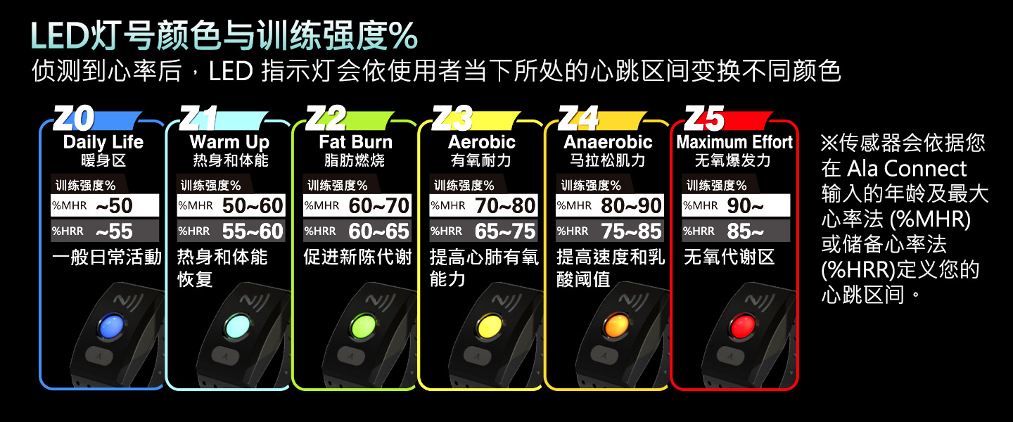 运动过程直接观看LED灯号显示,即可了解及调整 运动时心率强度,让您运动更直觉更有效率。